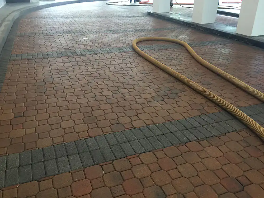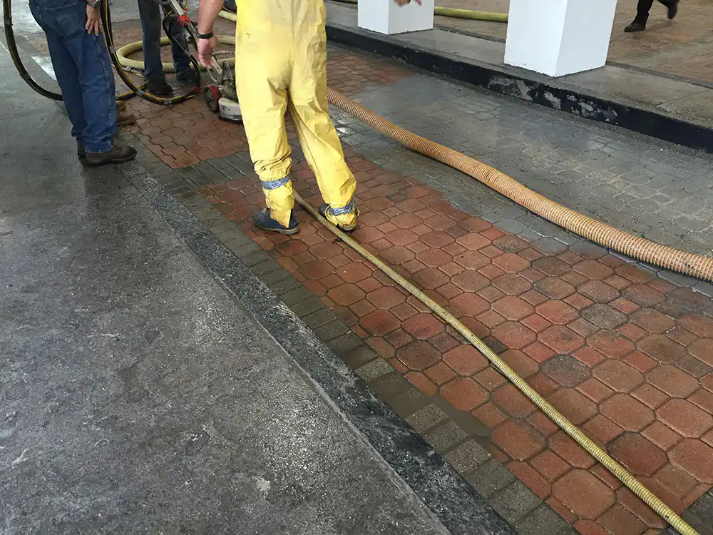 National Sealing has the ability to strip existing sealer from brick pavers, strip paint from cement, using concentrated water pressure. This stripping equipment can attain up to 40K PSI to remove existing paints and sealers from various surfaces.