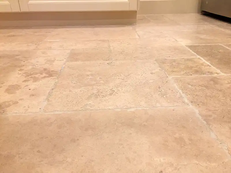 This example is a type of stone that requires a very large grout line. In addition, the grout is WHITE to match the stone. The goal was to keep the grout clean. We might add this is in a kitchen which will get much dirtier at twice the pace due to kitchen greases. Our coating is the most durable approach there is to preserve grout.